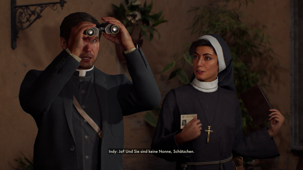 Aber das Spiel bietet nicht nur Prügeln und Schleichen, sondern auch typische Indy Rätseleinlagen. Da müssen Schriften entziffert werden. Oder Statuen zurecht gerückt werden. Oder auch klassisch Hebel umgelegt werden. Es gibt also viel zu tun. Und um das ganze etwas einfacher zu machen, gibt es Rollenspiel typisch auch Upgrades für den Charakter. Wenn man Bücher oder Manuskripte findet, kann man diese für besondere Fähigkeiten einsetzen. Wie z.B. die „zweite Chance“. Wenn Indy wie im Film, sein verlorenen Hut aufhebt. Top.