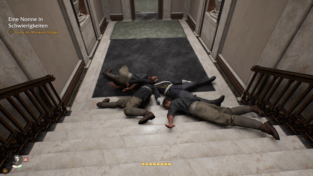 Kommen wir auch gleich zu der Gegner-KI. In den Schleichphasen agieren eher etwas subtil. Sollte ein Gegner auf den Boden liegen, gibt der andere zwar Alarm, aber mit der Zeit hat er es auch schon wieder vergessen.